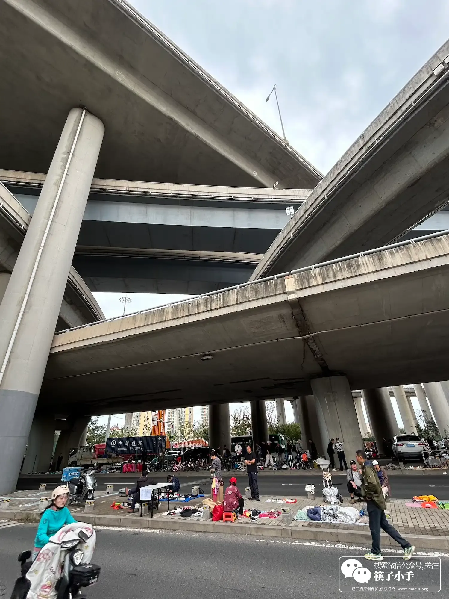 还没进集,就远远看着天桥下的五花八门,脚就有点挪不动了。眼前的路被摊位挤得只剩中间一条窄道,左边是跌打损伤药膏的带货达人,右边是挂着五颜六色旧衣服的铁丝架,往前望,铺子一个接一个,一直铺到大路尽头,少说也有几千个摊位。我原本以为大集卖的都是新鲜玩意儿,没成想最先抓住我目光的,是个摆着旧物的小摊。