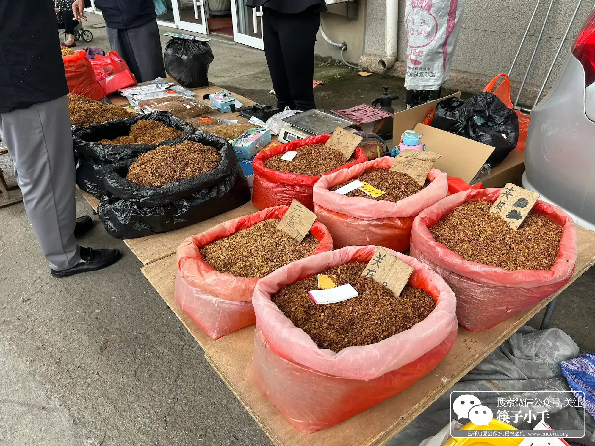 顺着旧物摊往里头走,一股呛人的烟味突然飘过来,我下意识地捂了捂鼻子,抬头就看见个摆着烟叶的小摊。摊主是个黑瘦的大爷,手里攥着根没点燃的烟,面前的竹筛子里摊着各种烟叶:深绿色的像刚摘下来,浅黄的带着点焦香,还有些发黑的,据说陈了好几年。每种烟丝都在一个大袋子里面,插标写着价:5 块、10 块、20 块。
