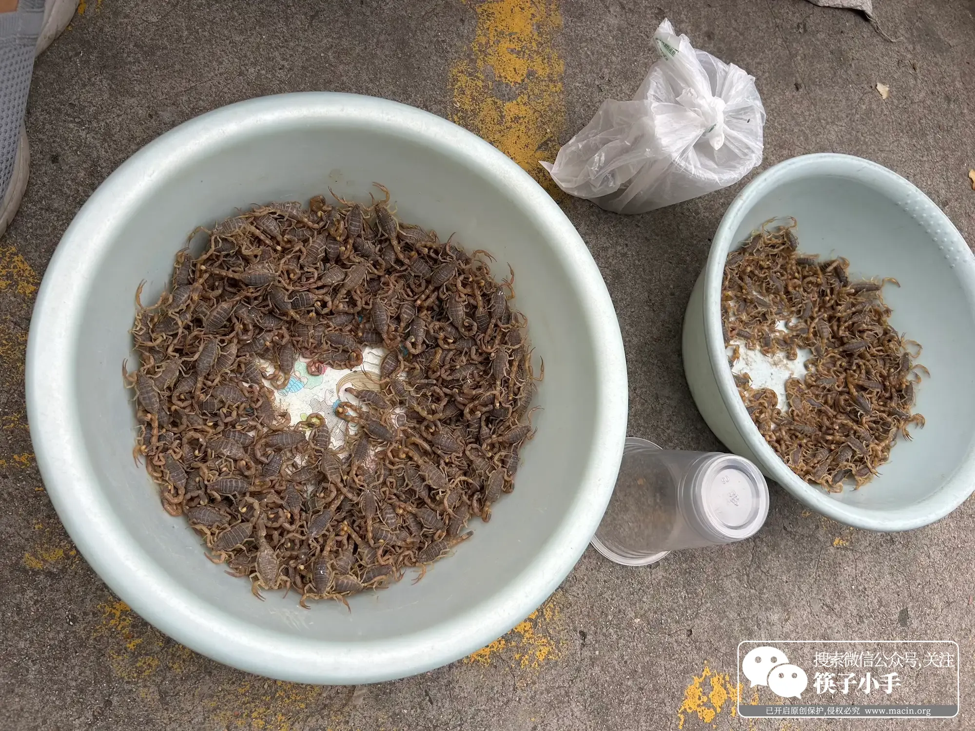 正跟着人流往前走,突然看见前面盆里爬满了黑乎乎的蝎子,钳子举着,尾巴翘得老高,密恐看了头皮指定得发麻。摊主是个大娘,手里拿着个小镊子,递给我同行得小伙伴,吓得他倒退了一步。小时候妈妈的朋友送来过炸蝎子,装在罐子里,金黄金黄的,我一开始不敢吃,妈妈说 “这是好东西,蛋白质高”,我才捏起一只放进嘴里。咬下去的瞬间,酥脆的壳里冒出点油香,那股子蛋白质的香味,到现在还记得。