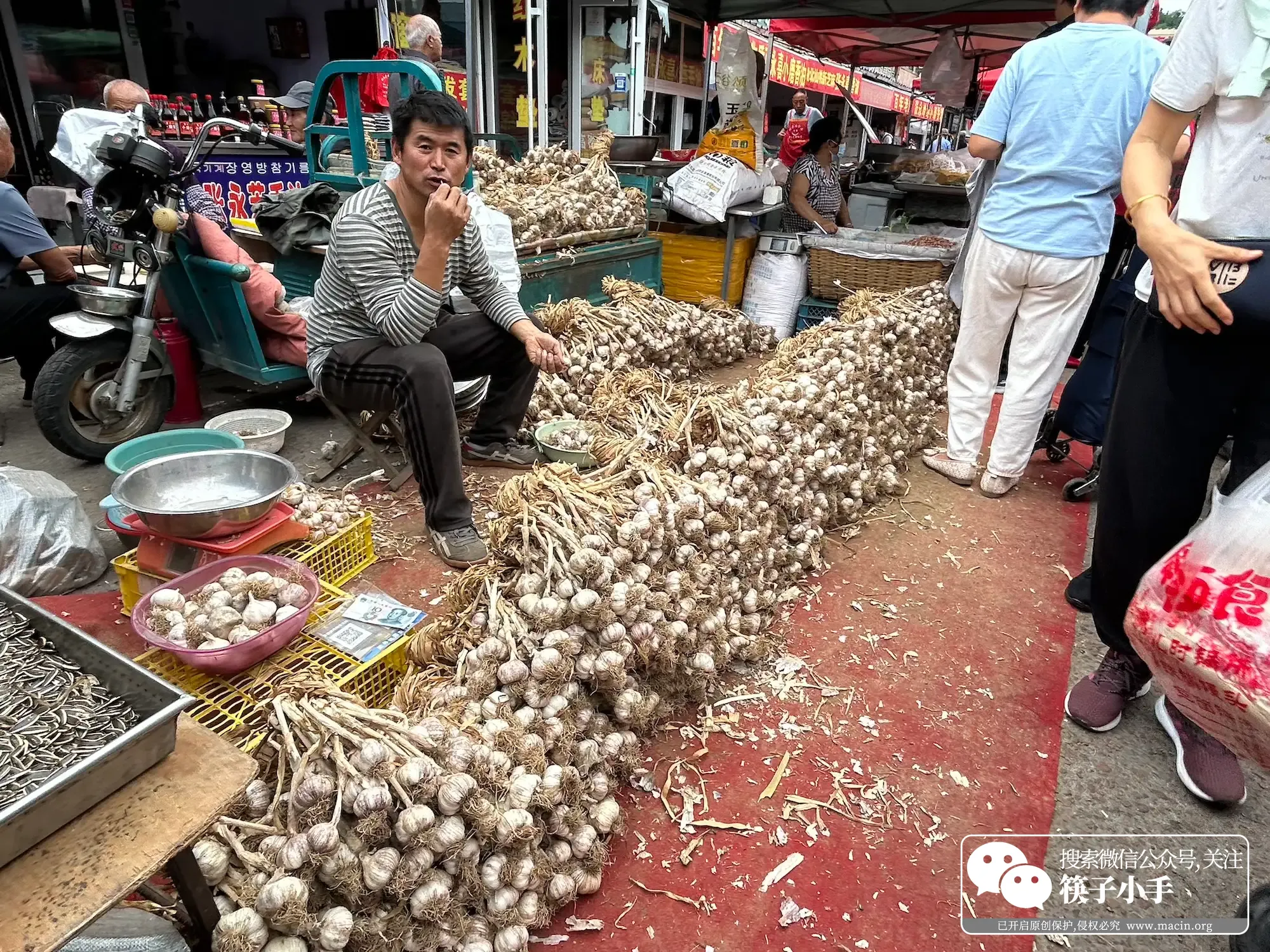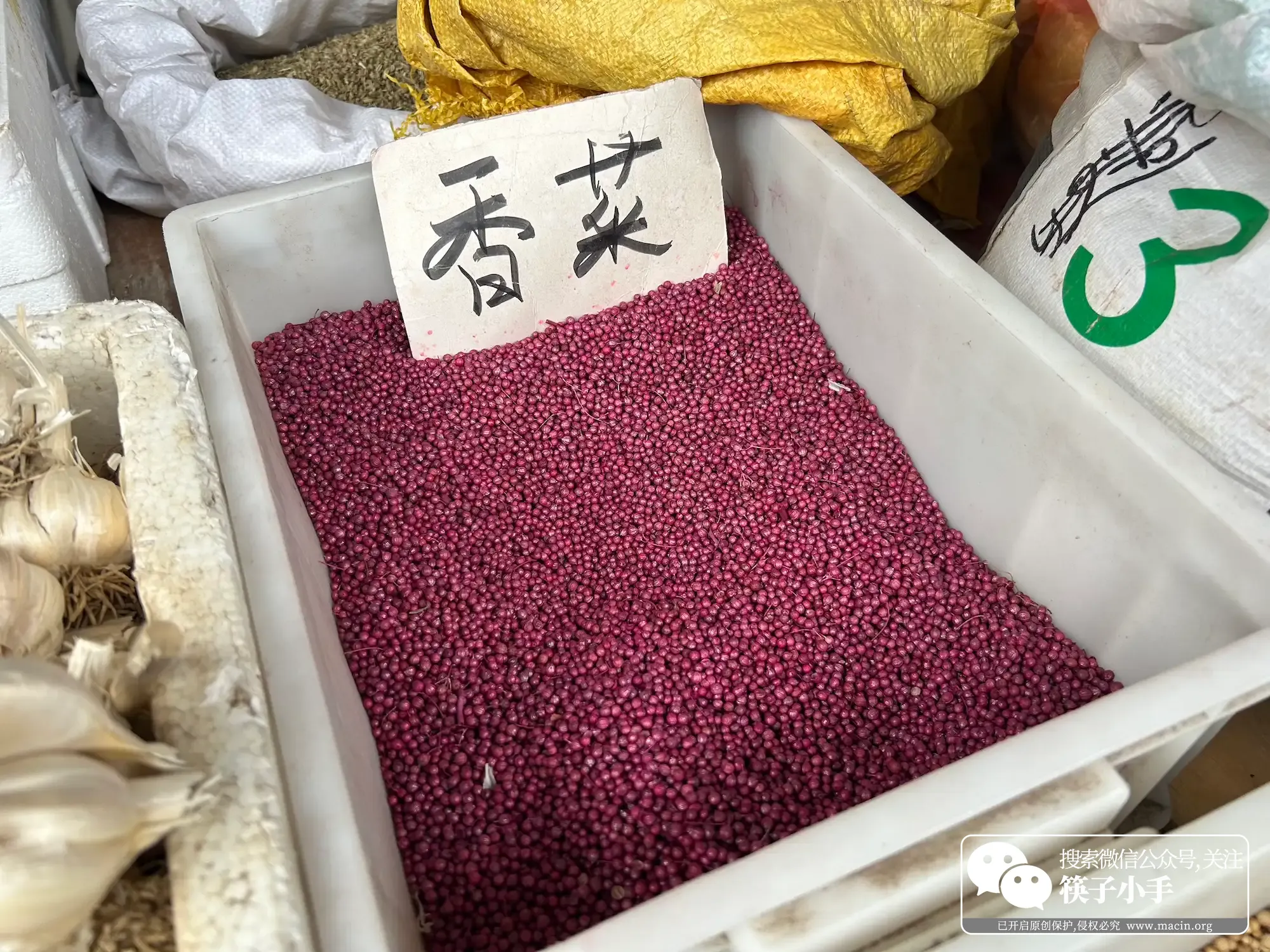 吃完饼,就到了卖干货和种子的区域。路边的摊位上,成捆的粉条累在小货车上白花花的,像一串串小瀑布;大葱绿油油的,根部带着泥土,捆得整整齐齐;大蒜辫得紧实,一挂挂摆在地上,透着股蒜香。再往前走,偶遇卖种子的小摊,各种种子装在小布袋子里,红的、黄的、绿的、黑的,摆得像彩虹。我凑过去看,发现香菜种子居然是紫红色的,小小的颗粒,像撒了把红砂糖!