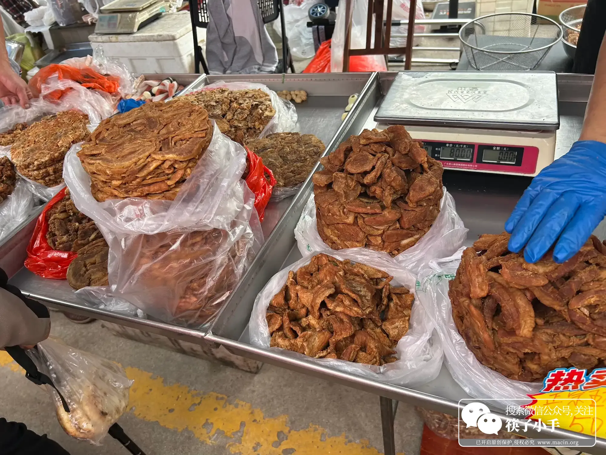 逛着逛着,突然闻到一股特别的香味,带着点肉香,我顺着香味找过去,发现是个卖脂渣饼的小摊。肥瘦相间得油渣盘在一起,咬下一口是炸过的脂肪的香气和瘦肉的嚼劲。