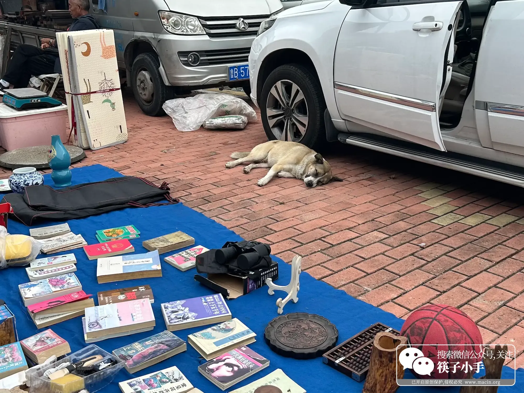 逛到一半,突然看见个特别治愈的画面:一个五金摊旁边,趴着一只黄狗,不管周围人来人往、叫卖声、讨价还价声多热闹,它都闭着眼睛睡觉,尾巴偶尔轻轻晃一下,阳光照在它身上,毛软软的,看起来特别舒服。我蹲下来想摸它,它睁了睁眼,看了我一眼,又闭上了,好像在说 “别打扰我睡觉”。