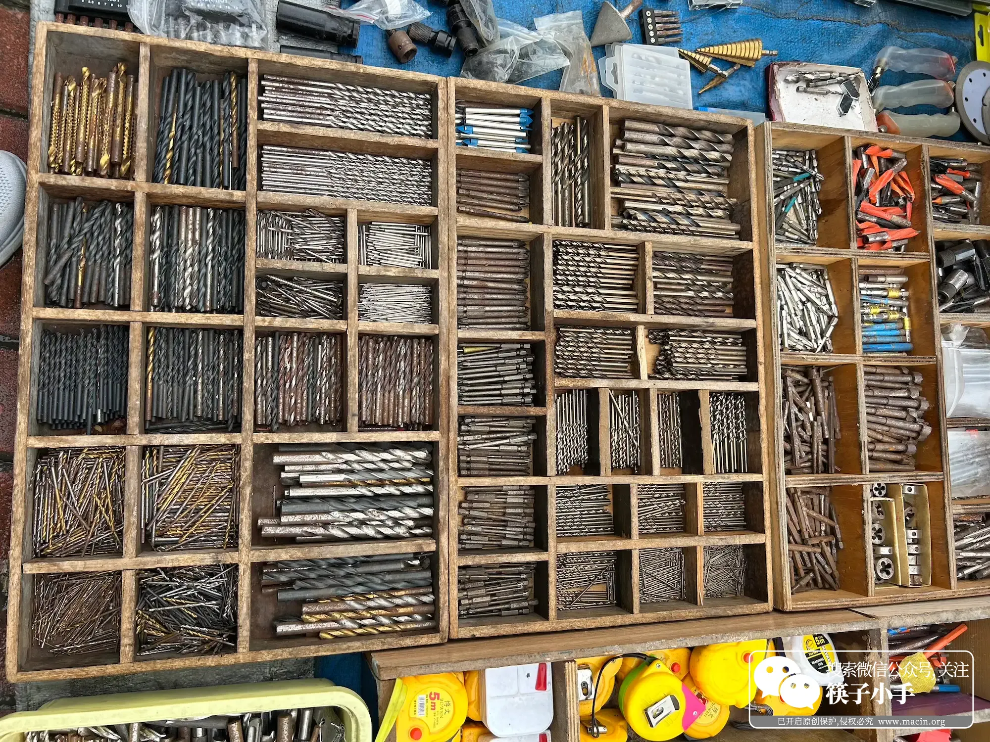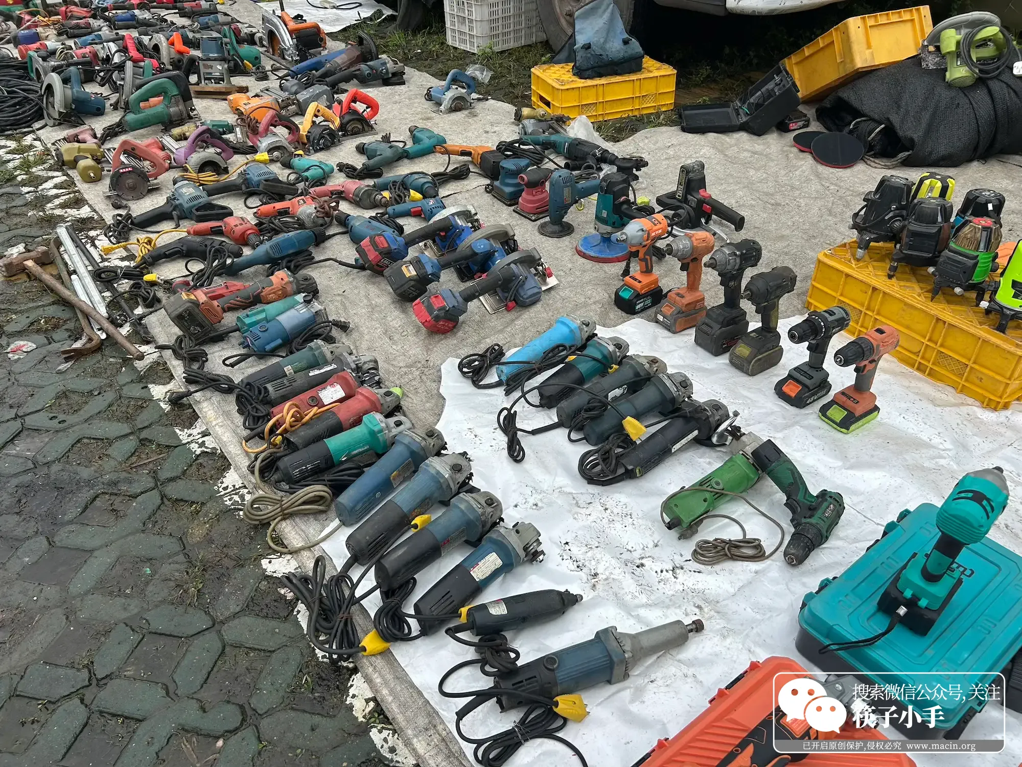 这个五金摊也特别有意思,摊上啥都有:锃亮的电钻、各种型号的螺丝、扳手、钳子,还有锣鼓铙钹,金属的光泽在阳光下闪着光。旁边还有个大叔买了一套锣鼓铙钹, 摊主麻利地给大叔打包。