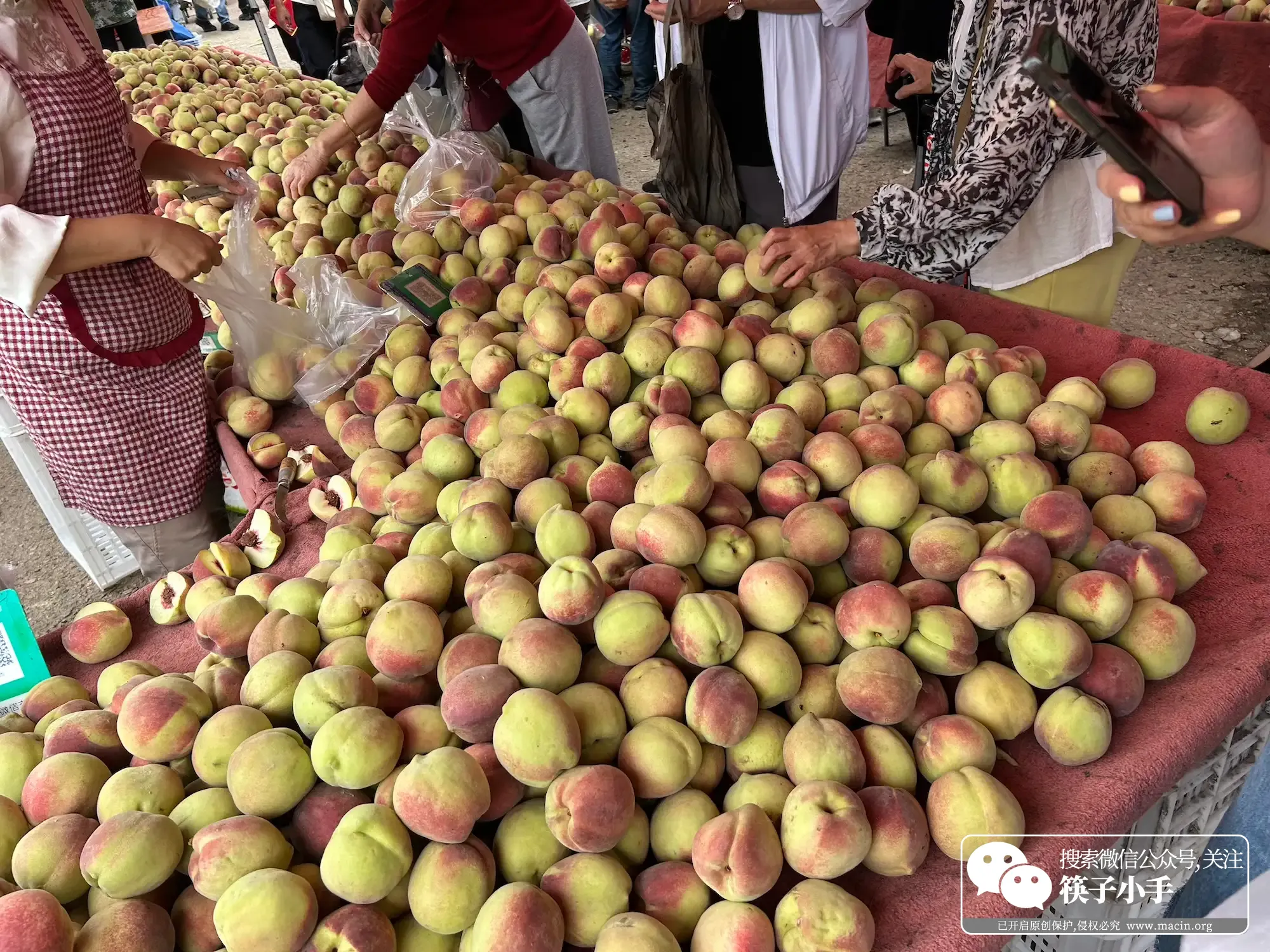 临走的时候,看见个卖桃子的摊儿,摊上的桃子都是青绿色的,像一个个小疙瘩,有些桃子还裂了口,看起来品相不太好。大姐拿起一个裂口的桃子,掰成两半,“你尝尝,不甜不要钱。”