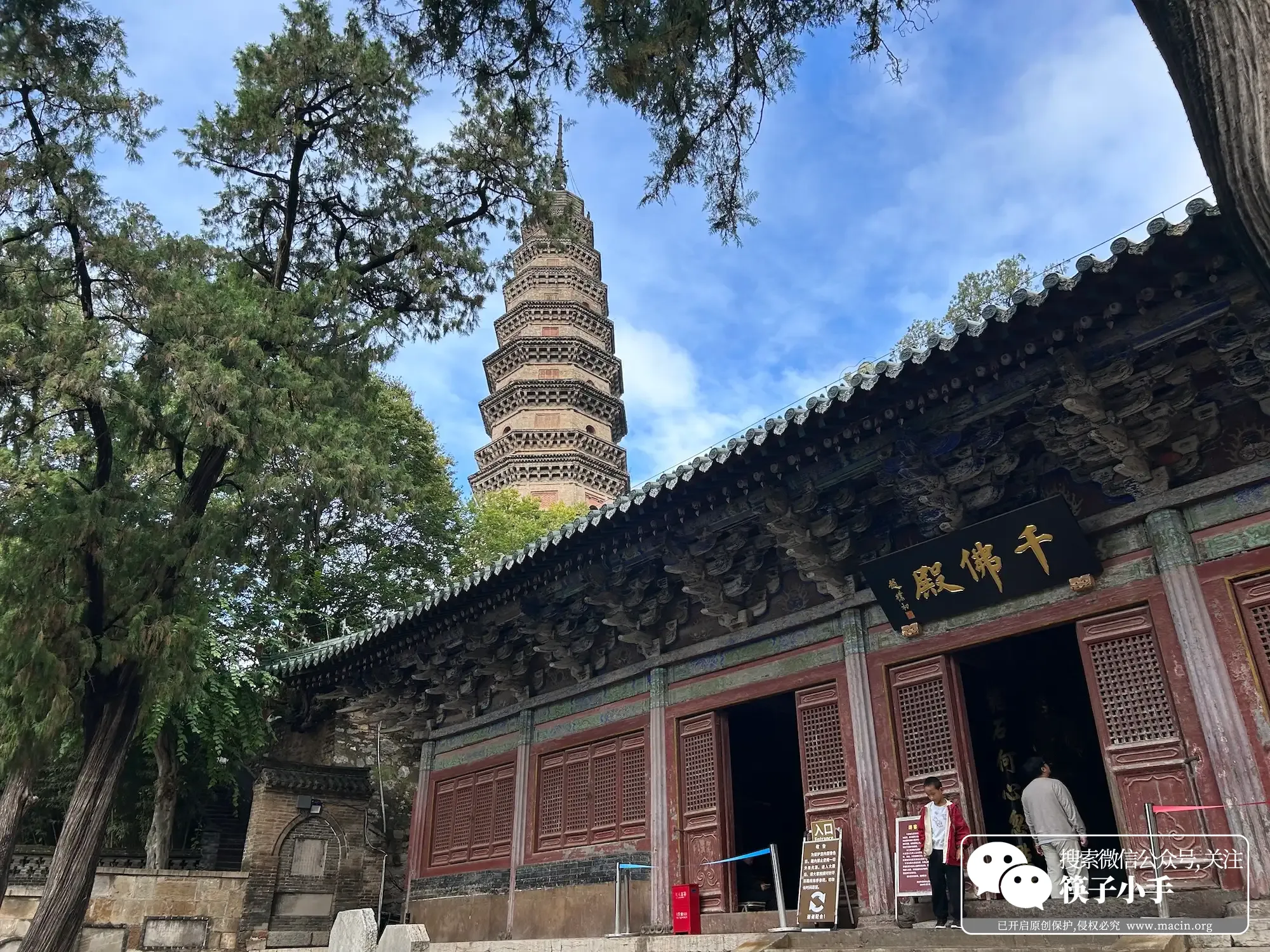 从千佛殿绕到西北侧,辟支塔的轮廓便撞进视野。这尊隋代始建、唐代重修的佛塔直插云天,塔身砖石泛着青灰的光泽,每一层檐角都挂着风铃,风过时分,清响能漫遍整座山谷。仰头细看,塔身雕刻的飞天与力士虽已风化,衣纹的褶皱却仍清晰可辨,砖缝里嵌着几星枯草,是岁月漏下的胡须。