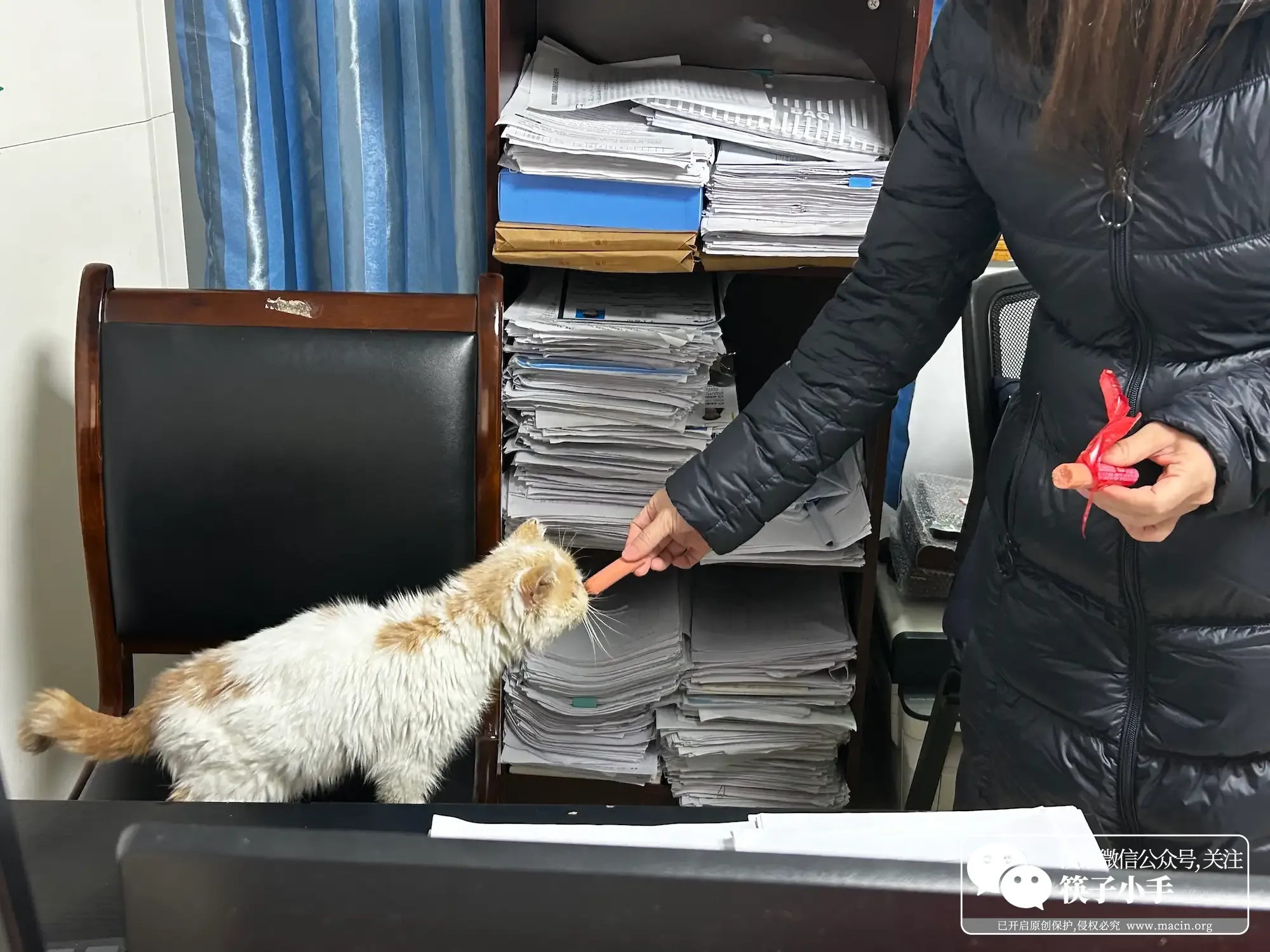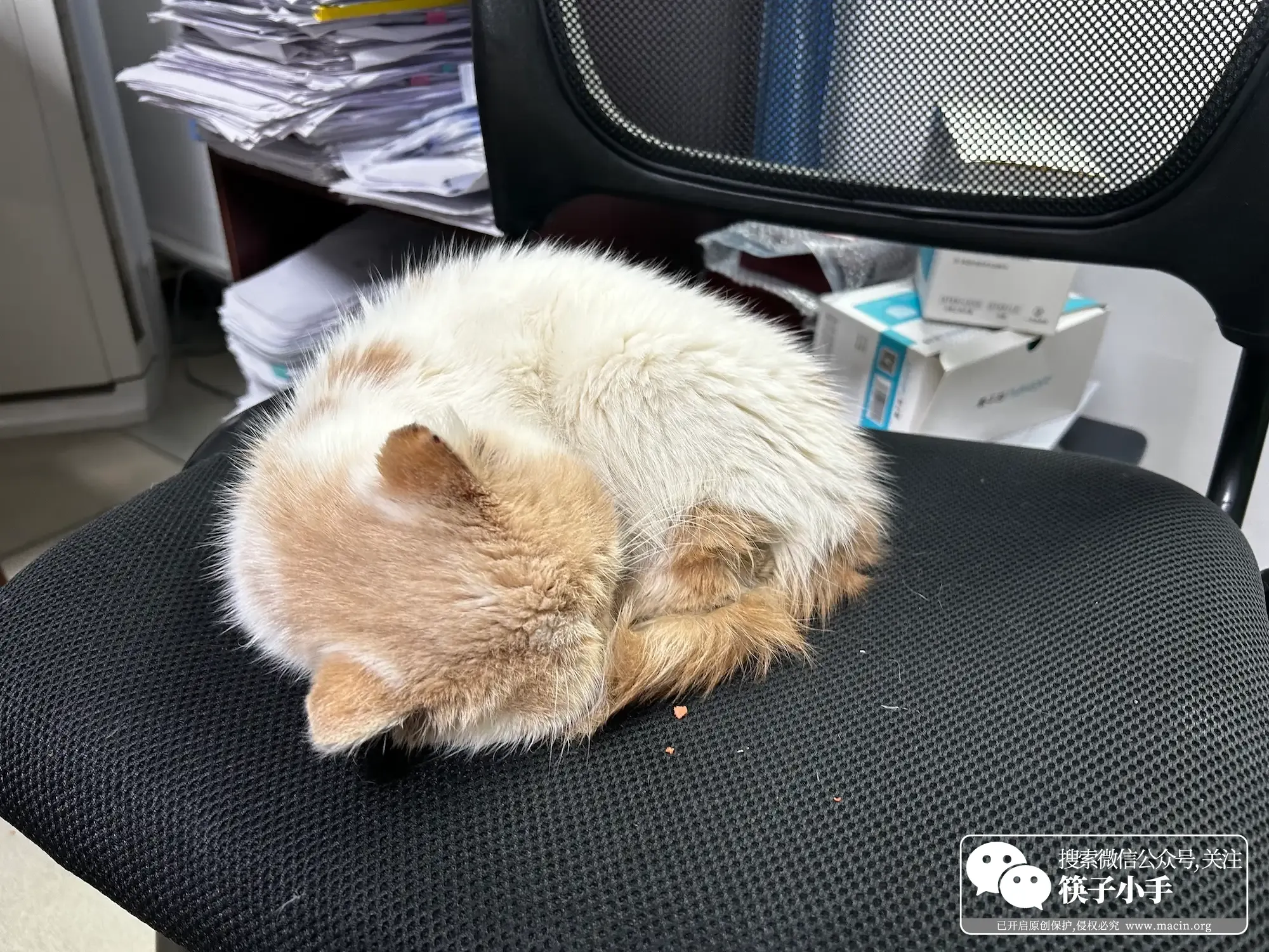 姐姐的办公室开着暖风,是个温暖的角落。小猫到了姐姐的工位上,就再也挪不动道了。姐姐刚离开座位不久,皮垫子上还留着人的体温,小猫就这样鸠占鹊巢,蜷缩在那一方温暖里。